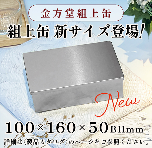 2026.04.27 製品 組上缶に新サイズ100×160×BH50mm登場 金方堂の組上缶に新たなサイズ100×160×BH50mmが追加になりました。 一番人気の組上缶87×140×BH53mmよりもひとまわり大きくギフト企画や少し高級な路線にも最適なサイズ感です。 カタログページにも追加されていますので、詳細は営業部までお問い合わせください。